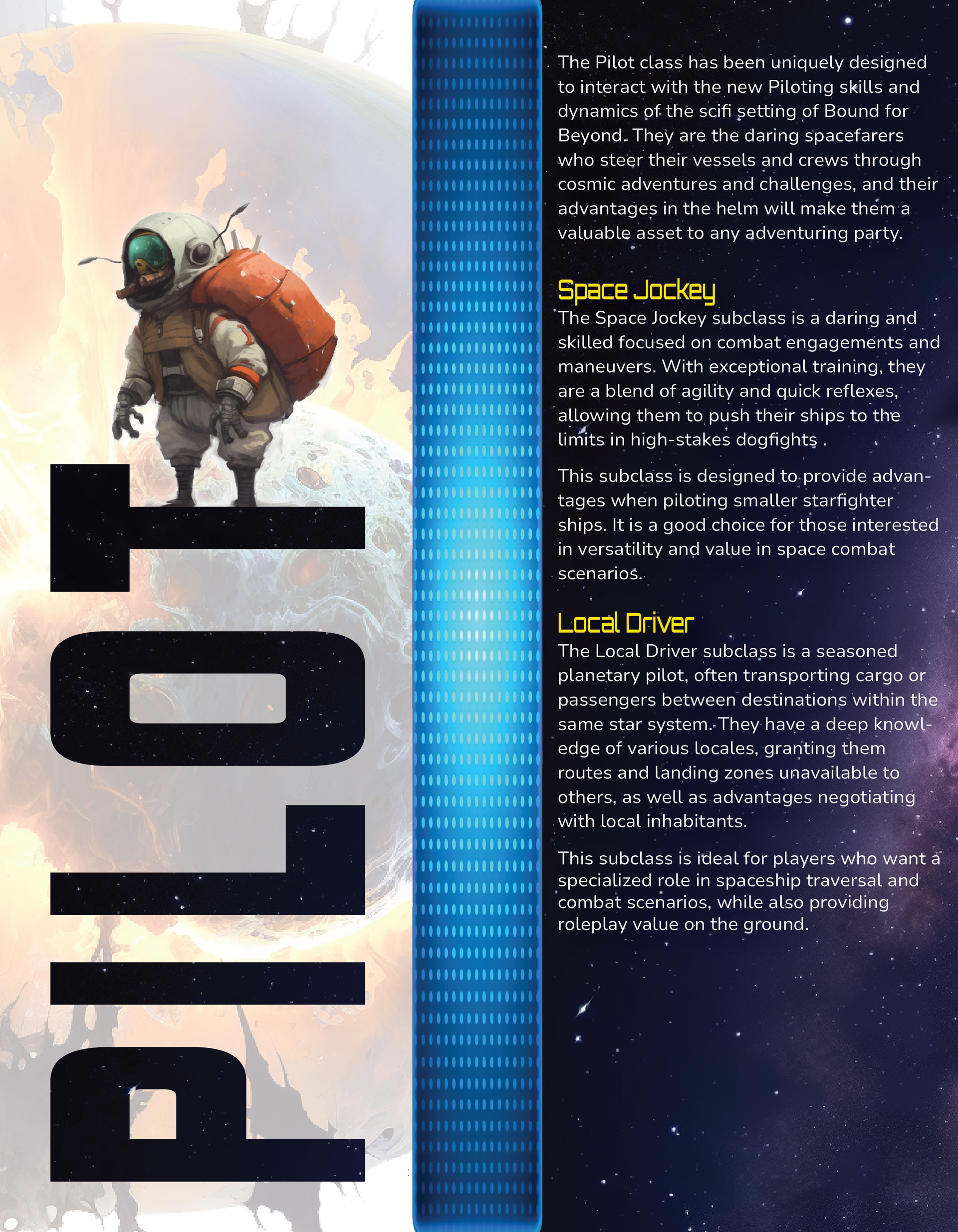 Bound for Beyond adds six new classes designed for both traditional 5th edition play as well as new systems like space combat. Each class also features subclass paths.