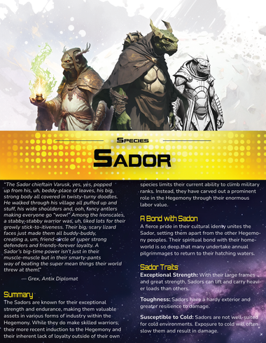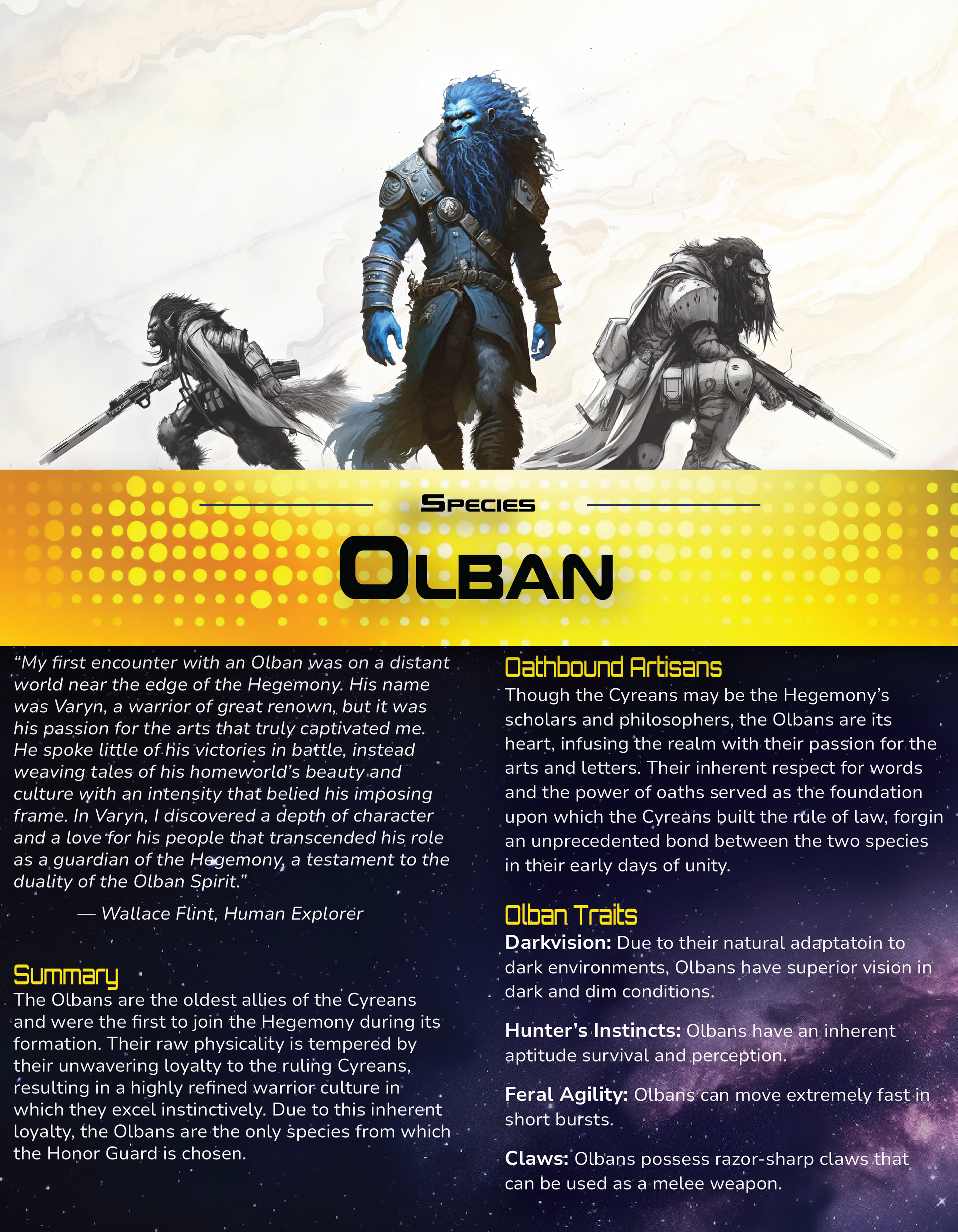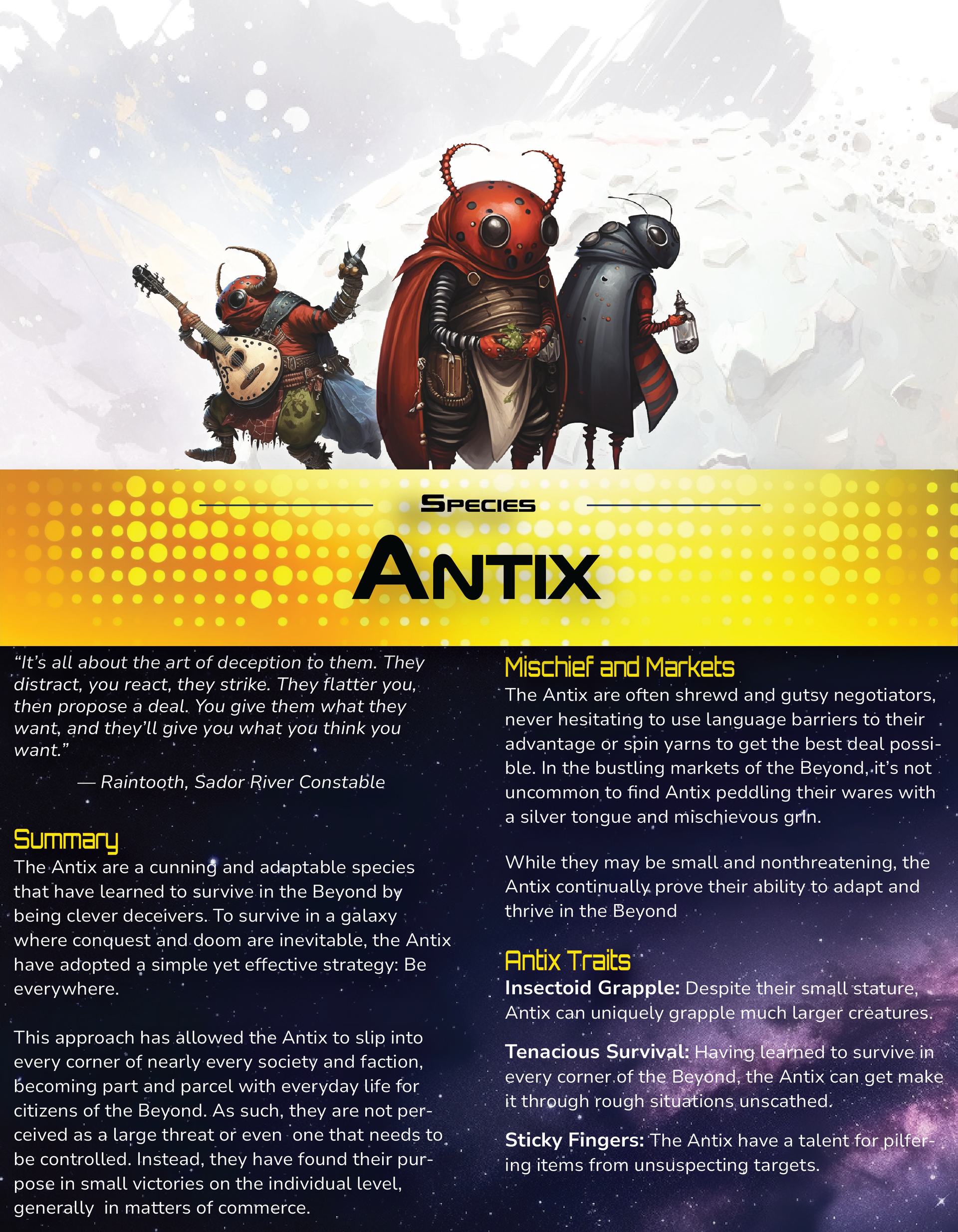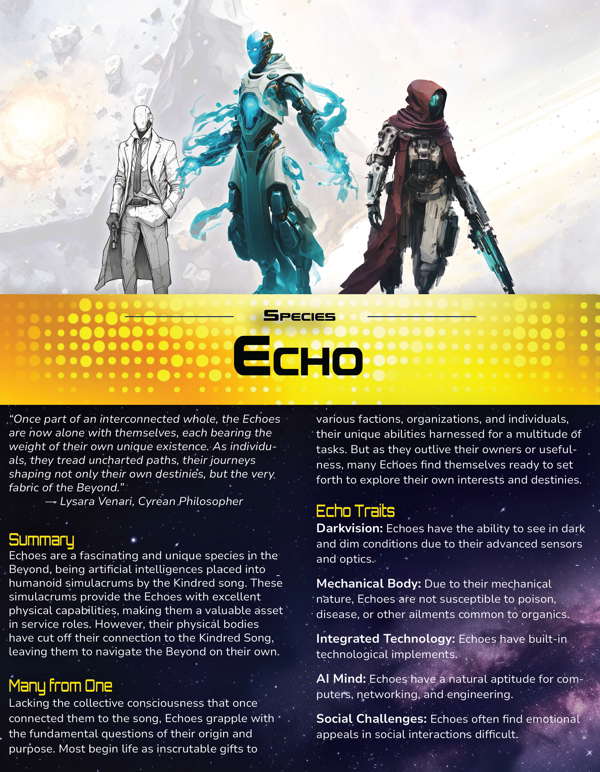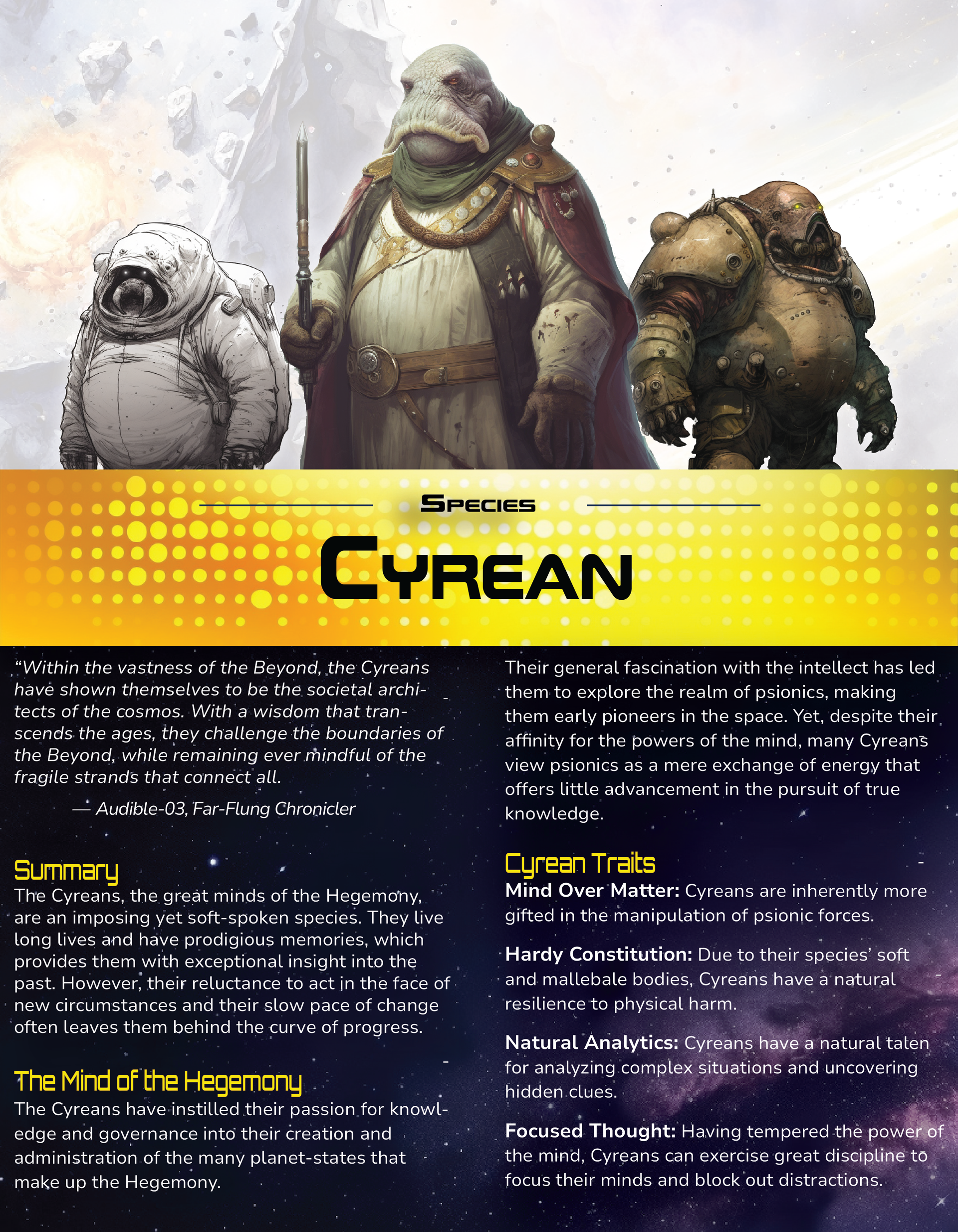 Check out the slip sheets below to learn about Bound for Beyond's new playable species. Please note that these are general introductions to each species and do not cover specific skills and abilities covered in the core setting book.